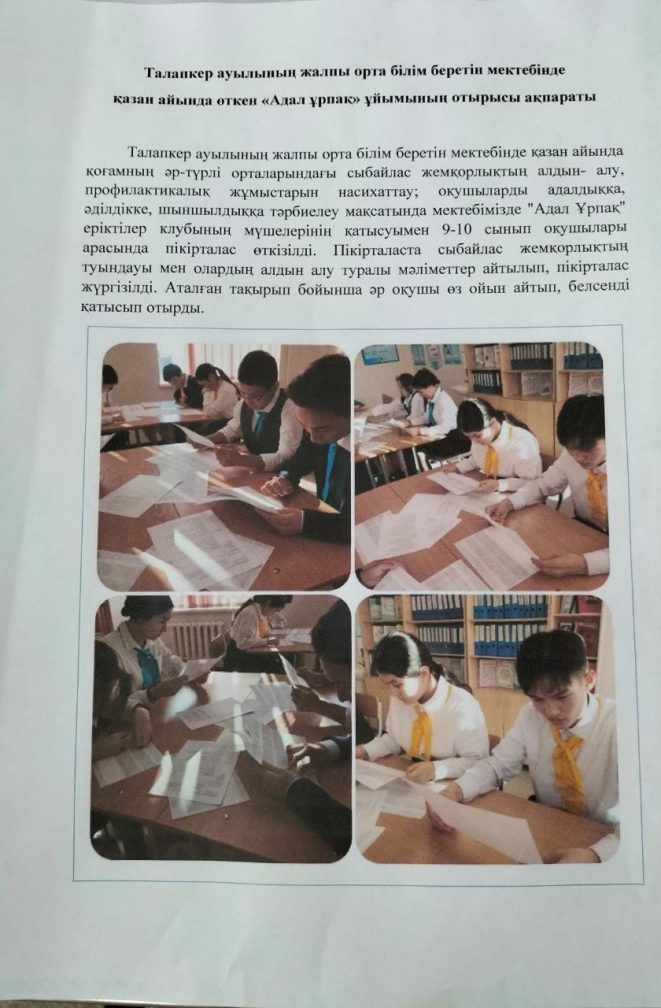 Информация о собрании организации «Адал ұрпақ», состоявшемся в октябре в СОШ села Талапкер
